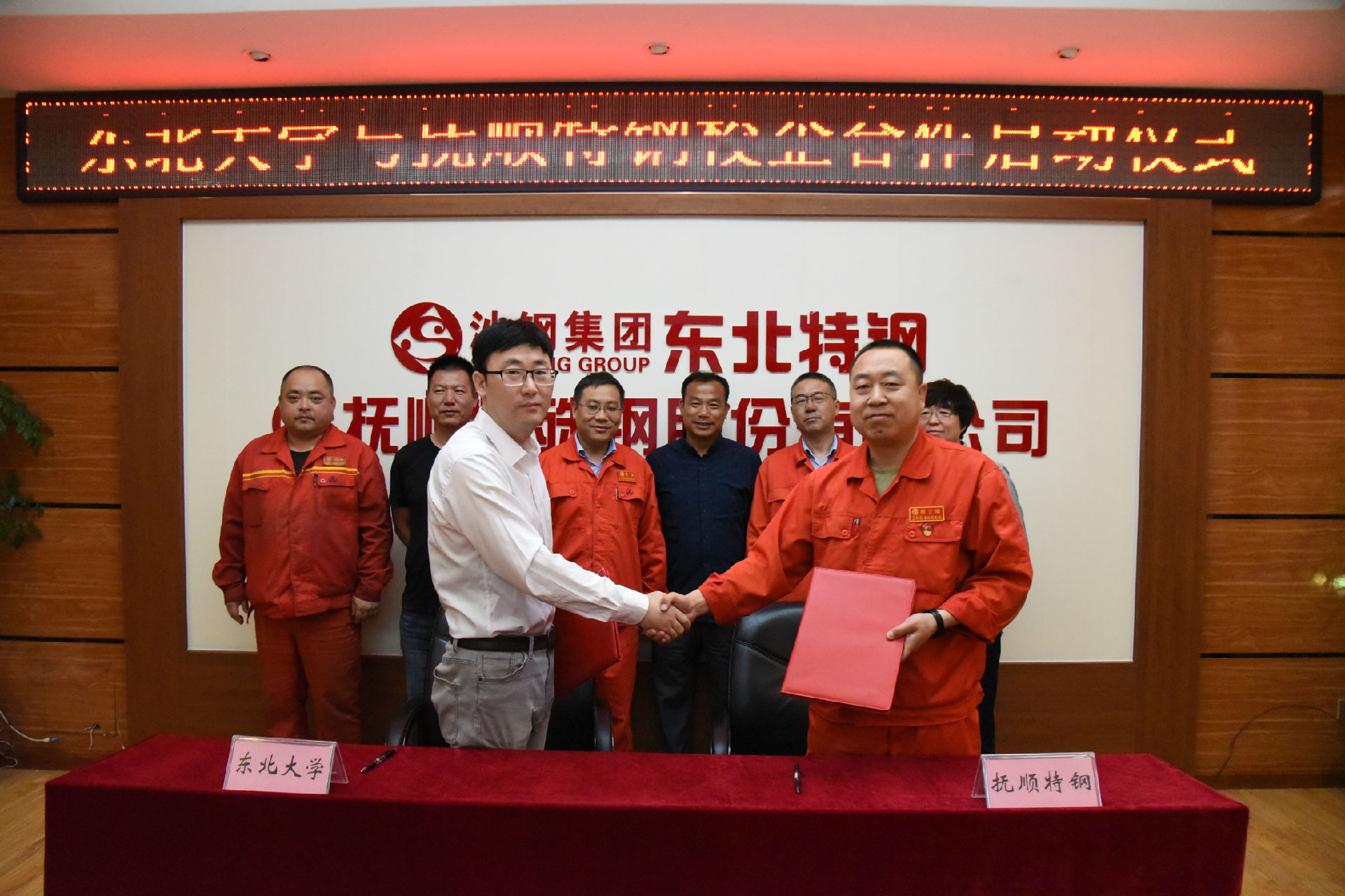 啟動(dòng)儀式上,撫順特鋼連軋廠廠長(zhǎng)穆立峰與東北大學(xué)副教授呂伍分別代表?yè)犴樚劁摵蜄|北大學(xué)在合作項(xiàng)目書(shū)上簽字。